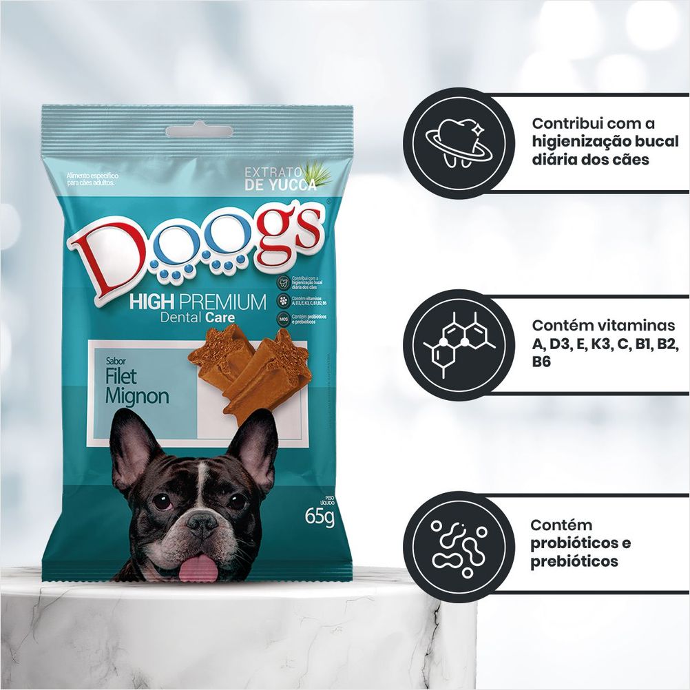 O Bifinho Dental Doogs Sabor Filé Mignon, em sua embalagem prática de 65g, foi especialmente desenvolvido para promover a higiene bucal dos cães de forma deliciosa. Com seu exclusivo formato em estrela, este petisco funcional atua na remoção de resíduos e na prevenção do acúmulo de tártaro, garantindo uma saúde bucal impecável. Elaborado com ingredientes de alta qualidade e com um irresistível sabor de filé mignon, é a combinação perfeita de nutrição e prazer para cães de todas as raças e portes. Transforma a rotina diária em um momento de cuidado e carinho, sendo um mimo e recompensa que seu amigo fiel jamais esquecerá.