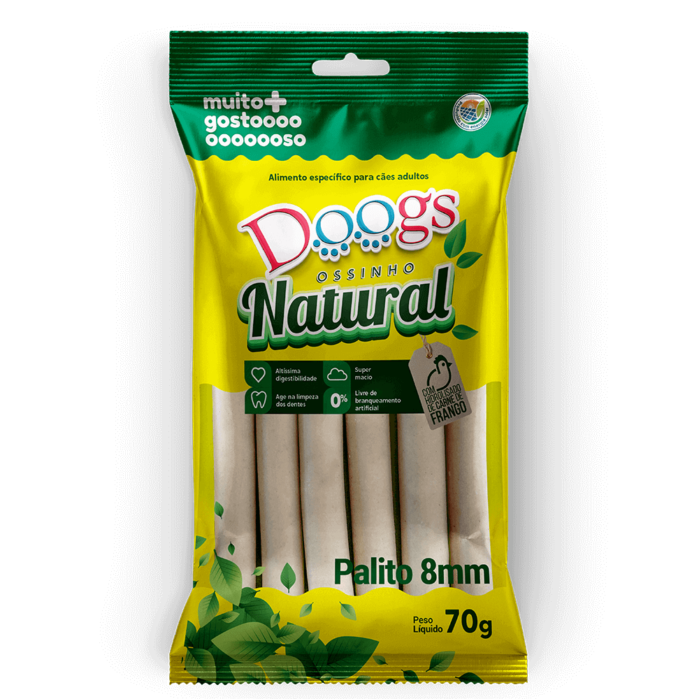 Cuide do seu cão adulto com o Ossinho Natural Palitos DOOGS 8mm 70g! Feitos com fécula de mandioca, sem raspa de couro e com altíssima digestibilidade, esses petiscos combinam sabor e saúde.